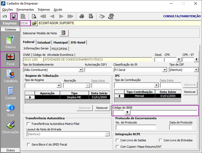 Observação, caso o código já esteja informado, mas não houve a integração, apague o código do IBGE no cadastro da empresa e salve. Informe o código do IBGE novamente e salve, desta forma, será movimentado o arquivo de integração no integrador eContador e o código será integrado.