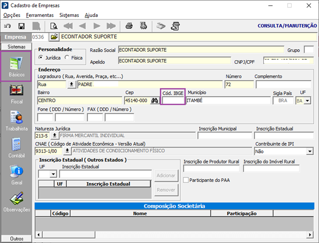 2- Informe o código da empresa e clique na aba “Básicos”. Preencha o campo código IBGE.