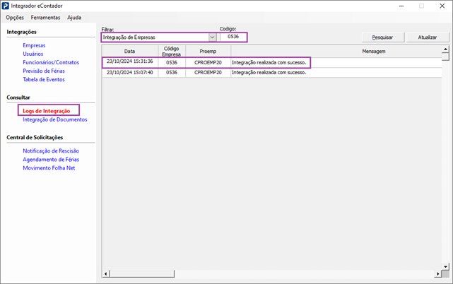 Acesse: Parâmetros Gerais > Integrador eContador > Clique em log de integração e realize a pesquisa por integração de empresa.