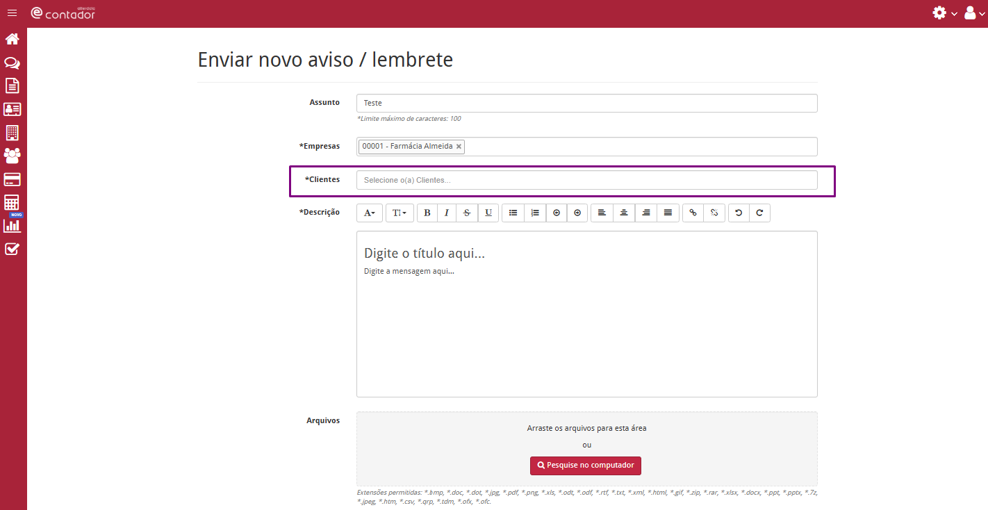 Este artigo orienta a como proceder quando, ao cliar Avisos e Lembretes, após selecionar a empresa, o campo "Clientes" não demonstra cadastros. A situação ocorre, porque não existe usuário como tipo "Clientes" cadastrados no portal do econtador.