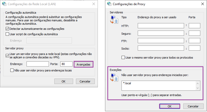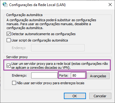 4. No campo "Endereço", digite o endereço do proxy e, no campo "Porta", a porta utilizada.