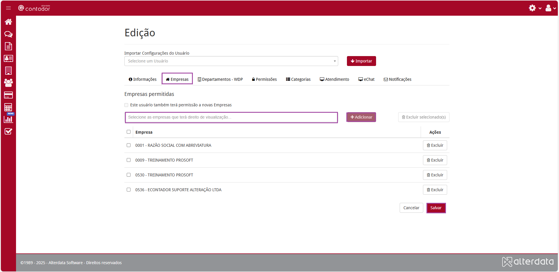 4- Atribua a permissão para empresa clicando em +Adicionar. Clique em Salvar.