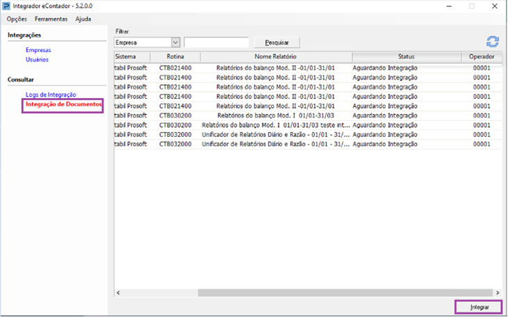 2 - Selecione os Documentos que deseja enviar ao Portal eContador e clique em Integrar