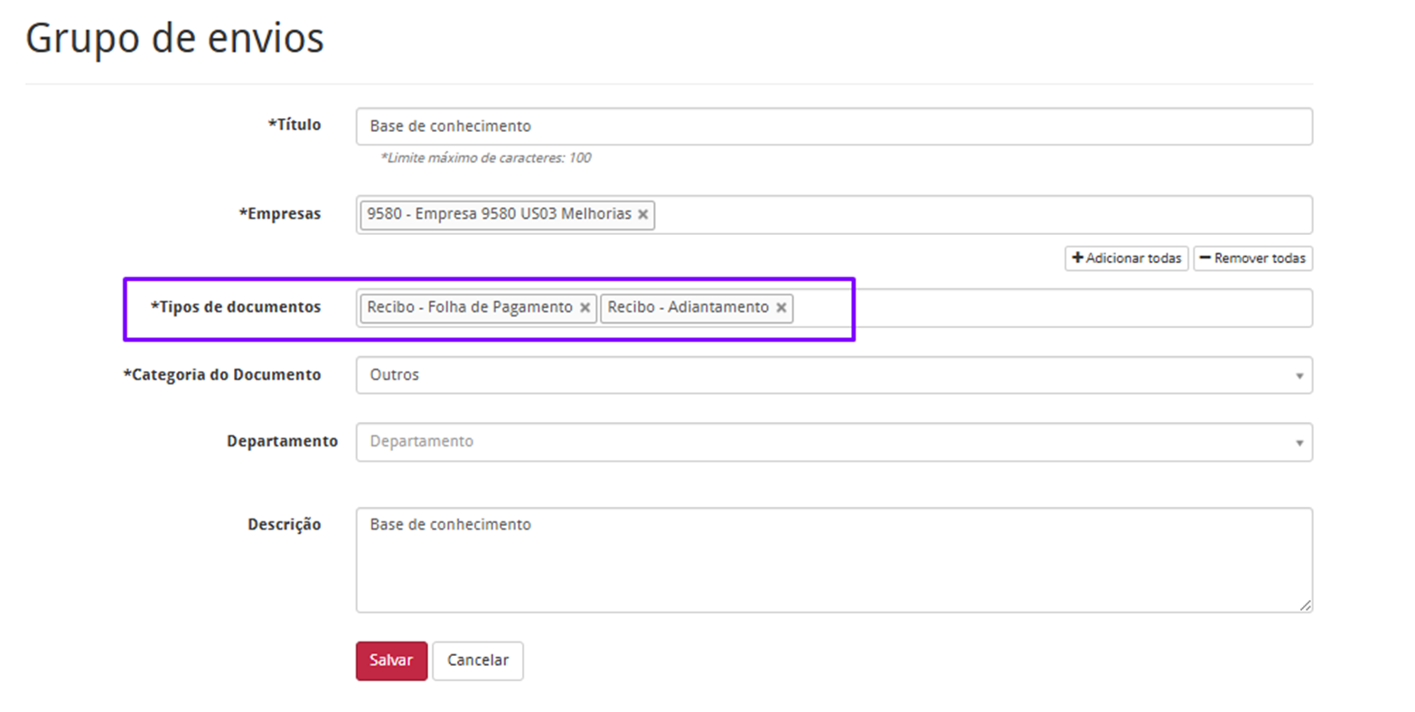 Agora que sabemos qual relacional de cada tipo de documento, começaremos configurando o “TIPO DE DOCUMENTO” para aglutinar o documento requerido, conforme a imagem abaixo estamos configurando para aglutinar o Recibo Mensal com o Recibo de Adiantamento.