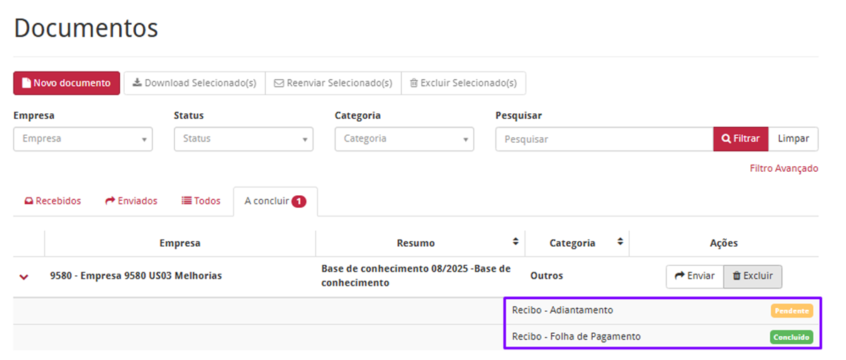 Até que todos os documentos do grupo sejam enviados ou que seja forçado o envio, o grupo permanecerá na aba “A Concluir” com o documento faltante com status “Pendente”, conforme a imagem abaixo, no qual um grupo com tipo de documento Recibo mensal e de adiantamento, apenas o mensal foi enviado