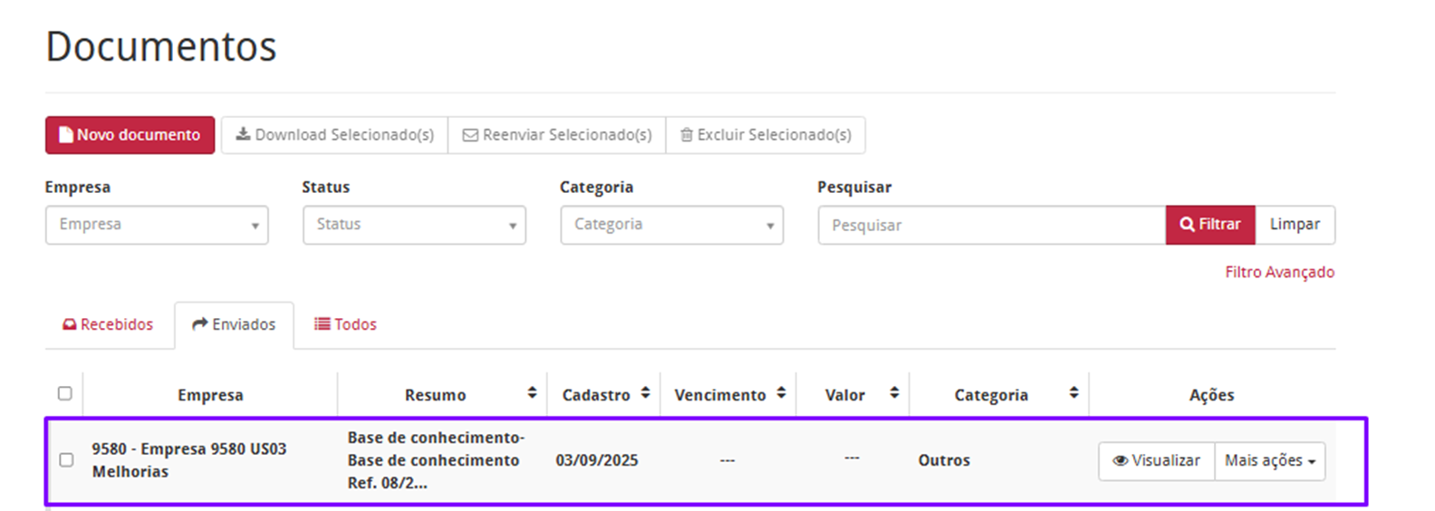 Quando feito o envio de todos os documentos configurados, o grupo é automaticamente movido da aba “A concluir” para a aba “Enviados” e é feito o envio para o e-mail para o responsável pela empresa configurado em usuários, conforme demonstrado.