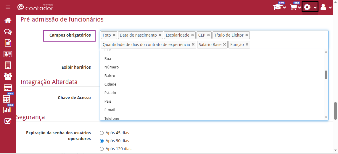 - Para configurar os campos obrigatórios para pré-admissão, clique na Engrenagem, depois em Configurações;