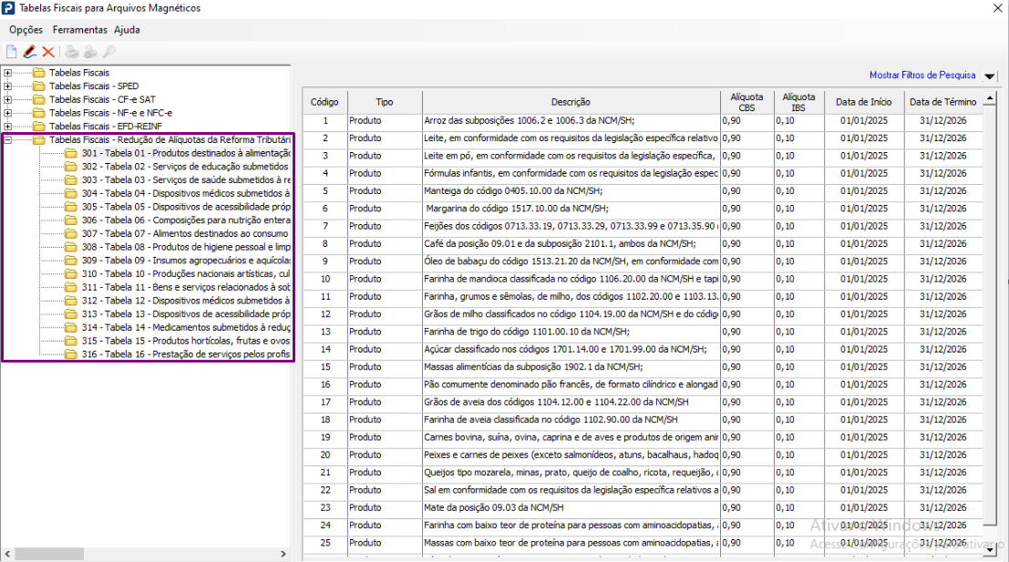 Apresenta as tabelas utilizadas para o Redução de Alíquota Reforma Tributária, que serão utilizadas no cadastro de produtos.