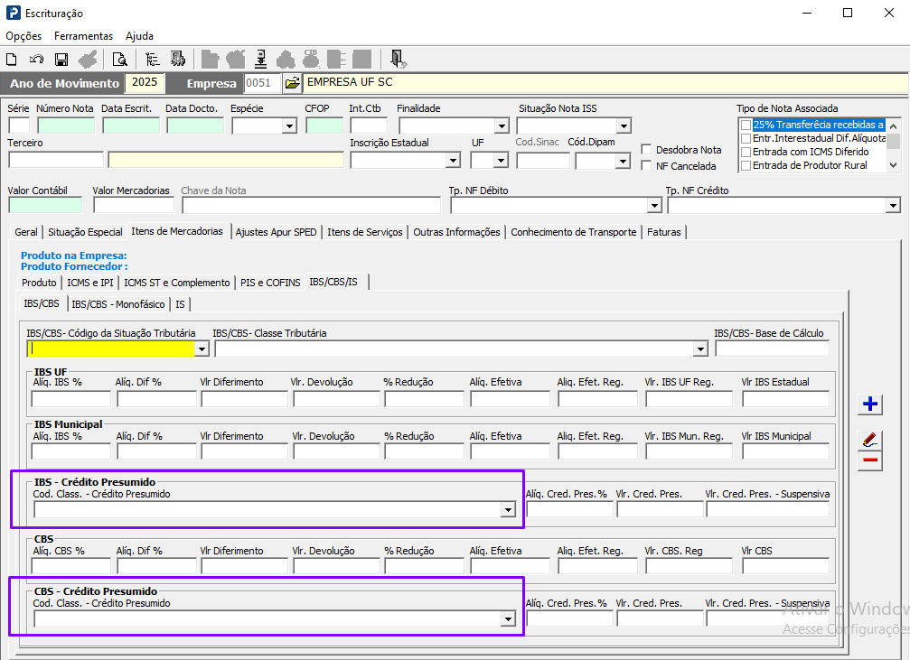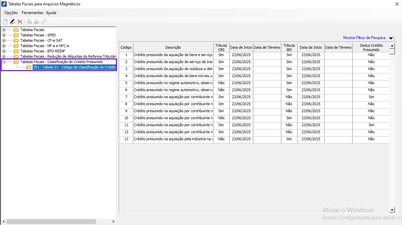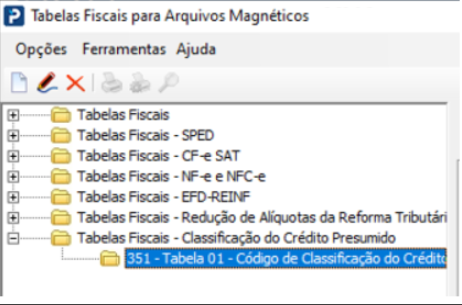 Tabelas Fiscais – Classificação do Crédito Presumido