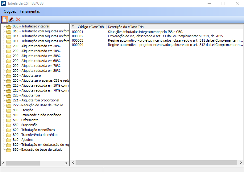2 - Ao abrir a rotina será apresentado as CSTs de IBS/CBS e ao lado o Código e a descrição da Classe Tributária.