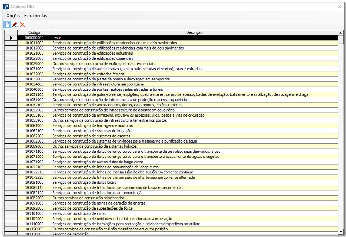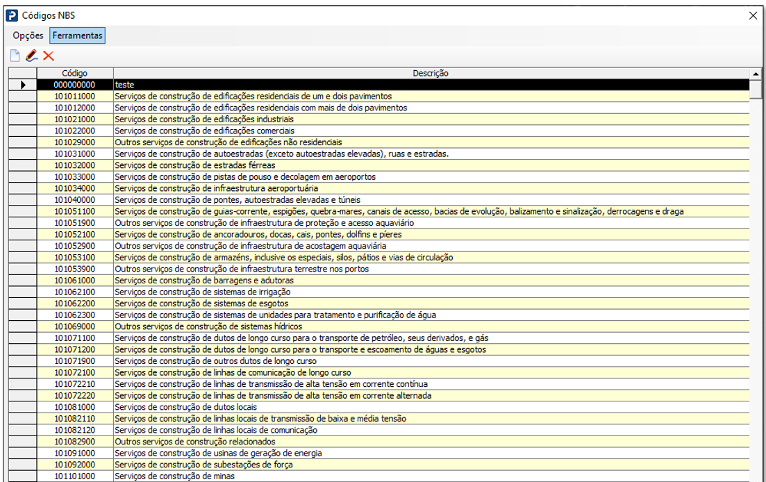 2 - Ao abrir a rotina será apresentado o Código NBS e ao lado a descrição.