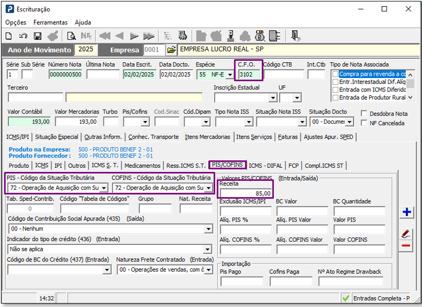 - CST PC: CST de PIS/COFINS do produto informado na escrituração;