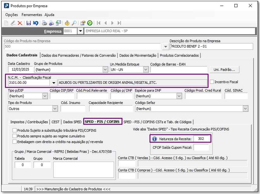 - Nat Rec: Natureza de Receita informada no cadastro do produto;