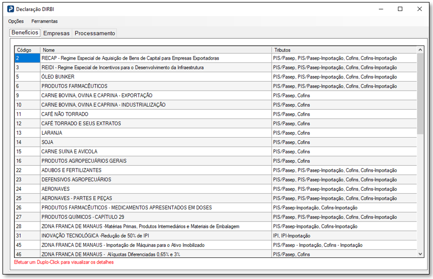 2- Na aba Benefícios, é possível verificar quais Benefícios estão disponíveis e dando um duplo clique no benefício, mostrará a descrição completa do Benefício e os tributos que ele contempla.