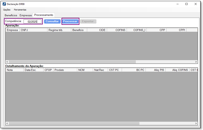 O grid Detalhamento de Apuração apresentará as seguintes colunas: