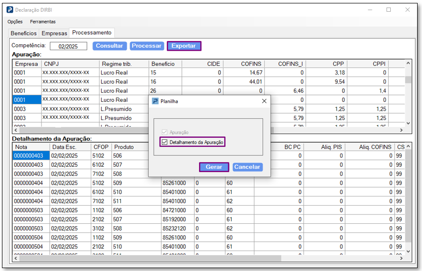 9- Caso deseje gerar a planilha com as informações do grid Detalhamento da Apuração, marque a opção ao gerar a planilha;