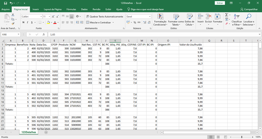 - Valor do Usufruído: Valor após a soma do valor de PIS + Valor de COFINS do produto ou Valor do IPI