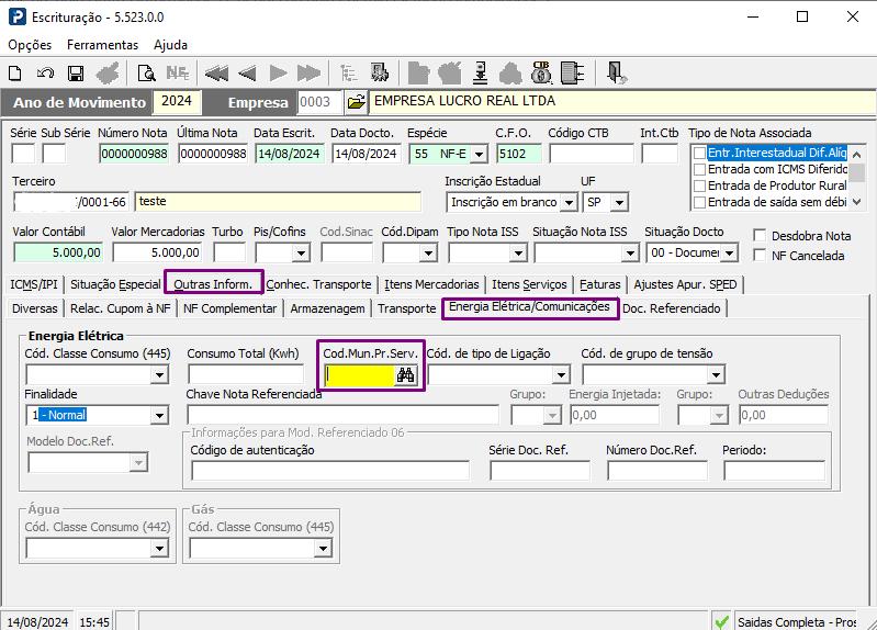 5-Vincule o Código do Município dos pontos de consumo no campo Cod. Mun. Pr. Serv.