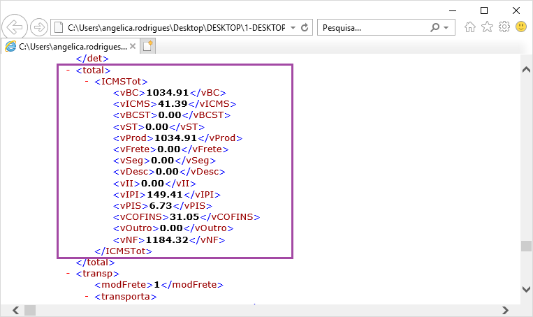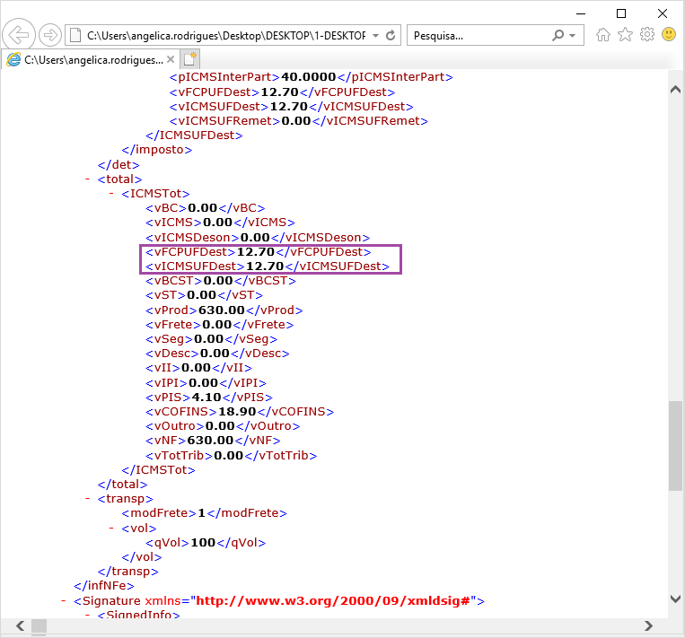 Contexto: Ao importar arquivo XML com DIFAL pela rotina de importação do fiscal, os valores de DIFAL não são importados, a situação ocorre, pois na tag de totais não possui valores de ICMS DIFAL. Este documento contém as instruções de como verificar na tag de totais do arquivo XML se os valores de ICMS DIFAL estão preenchidos.
