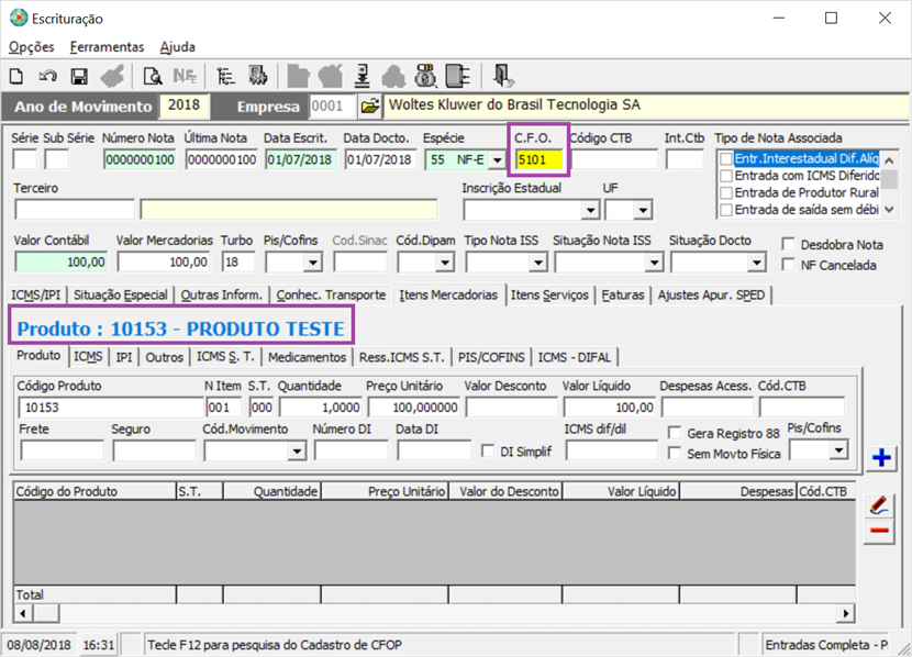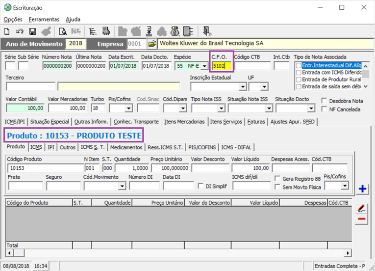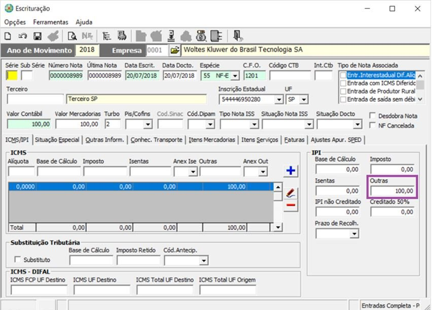 No exemplo a nota de saída correspondente à nota de entrada possuía valor de outras de IPI, nesse caso a nota de entrada deve possuir valor de outras de IPI