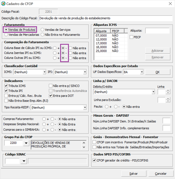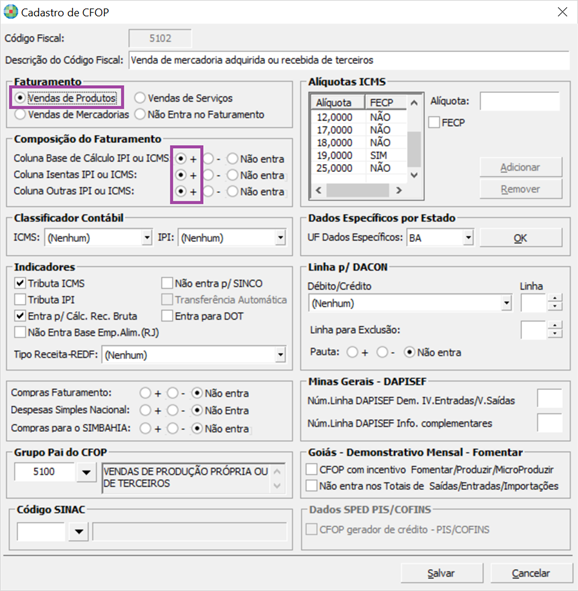 2- Somente será apurado pelo Bloco P, o CFOP que estiver com a seção Faturamento marcado com a opção Vendas de Produtos e na seção Composição do Faturamento selecionado a coluna positivo [+]