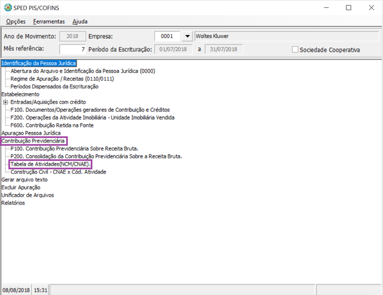4- Na rotina SPED PIS/COFINS selecione a opção Contribuição Previdenciária, em seguida a opção Tabela de atividades (NCM/CNAE)