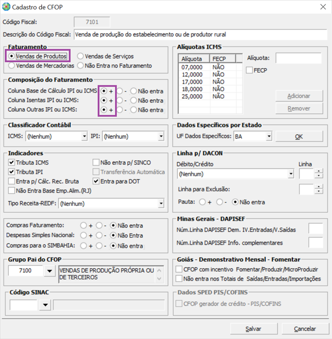 1 - Para empresas que realizam exportação, deve possuir o cadastrado CFOP iniciado por 7xxx, selecionado na seção Faturamento a opção Venda de Produtos e na seção Composição do Faturamento selecionado a coluna do positivo (+)