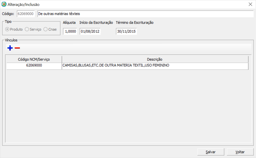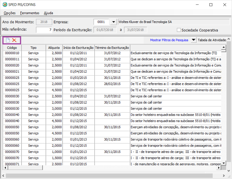 5- Ao acessar a tela de Cadastro Tabela de Atividade (NCM/CNAE) serão apresentados os NCM's que deverão ser vinculados ao Cadastro dos Produtos e/ou códigos de serviços, conforme Tabela 5.1.1 do SPED Contribuições