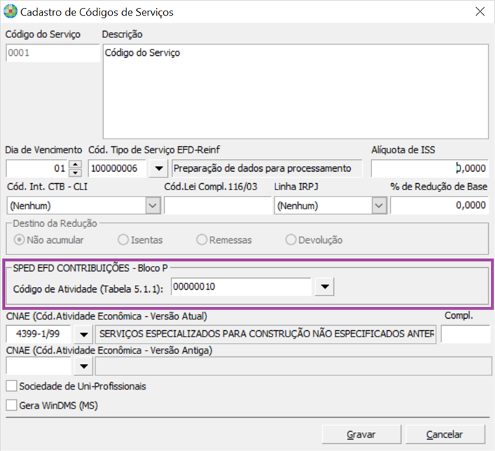 Composição de cálculo com base na Tabela 5.1.1. - Contribuição Previdenciária sobre a Receita Bruta - Códigos de Atividades