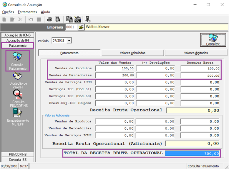 Observe que o faturamento total nesse exemplo é a soma das duas notas na escrituração, sendo separado conforme os dados do cadastro de CFOP