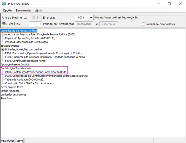 19- Selecione a opção Contribuição Previdenciária em seguida a opção P100. Contribuição Previdenciária sobre a Receita Bruta