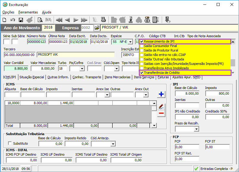 3- No campo Tipo de Nota Associada selecione as duas opções: Ressarcimento de IPI e Transferência de Crédito