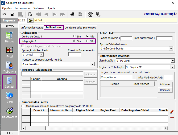 3- Acesse: Parâmetros Gerais > Cadastros > Cadastro de Empresas > Guia Contábil > sub guia Indicadores