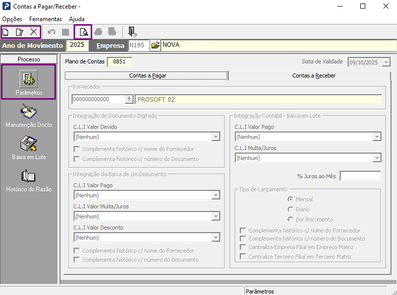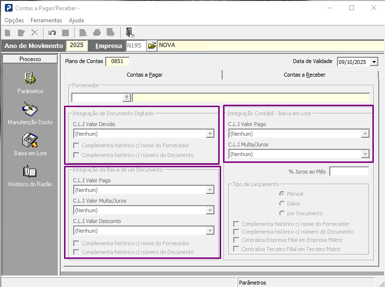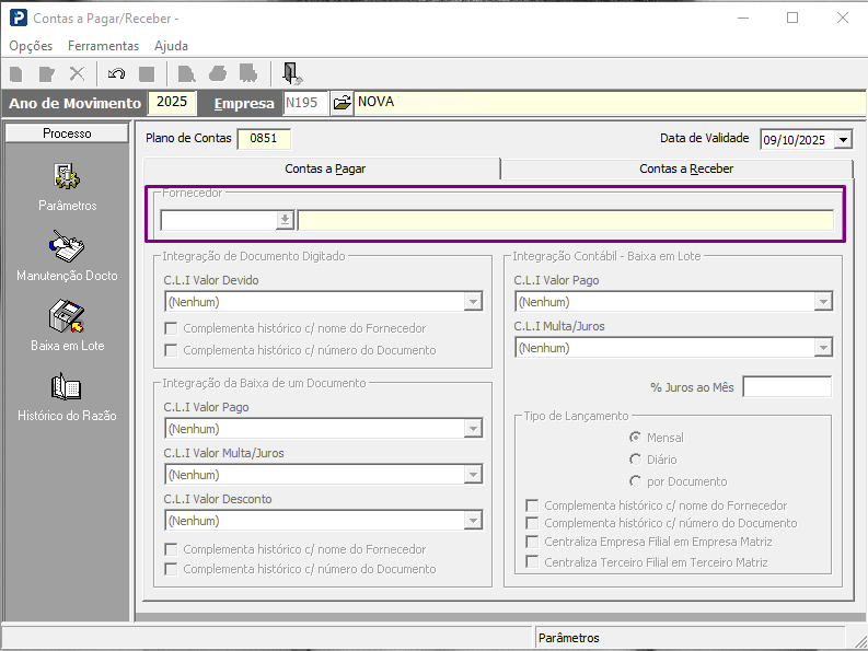 O campo Fornecedor é apresentado na guia Contas a Pagar e o campo cliente na guia Contas a Receber. Os campos são para criação de parâmetros por cliente e/ou fornecedor. Se o campo não for preenchido as informações cadastradas nos parâmetros serão válidas para todos os clientes e fornecedores.