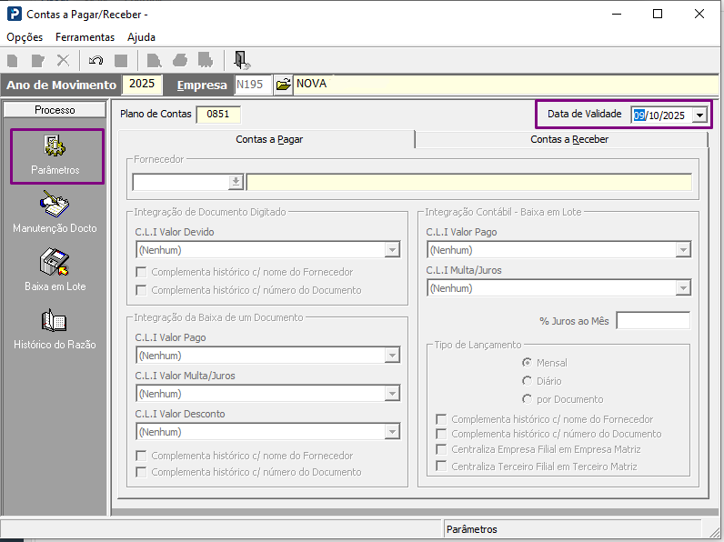 O campo data de validade é a data de Início de Validade do parâmetro cadastrado, é recomendável que exista um único parâmetro cadastrado para cada exercício e sua data seja sempre o primeiro dia do ano. Se for necessária a criação de um novo parâmetro com outra data, o sistema respeitará as datas para composição dos lançamentos.