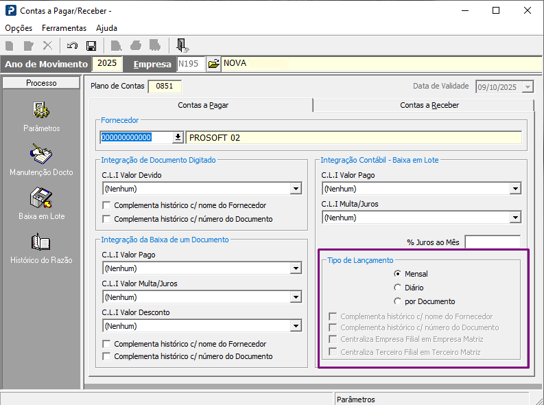 - Mensal: Selecionando essa opção, o sistema soma as baixas e gera um único lançamento mensal.