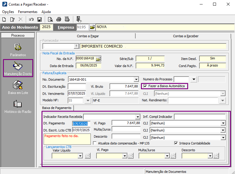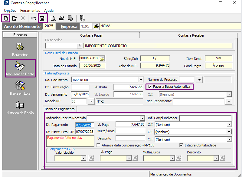 Quando a Condição de Pagamento da escrituração for à vista o sistema baixa automaticamente as faturas.