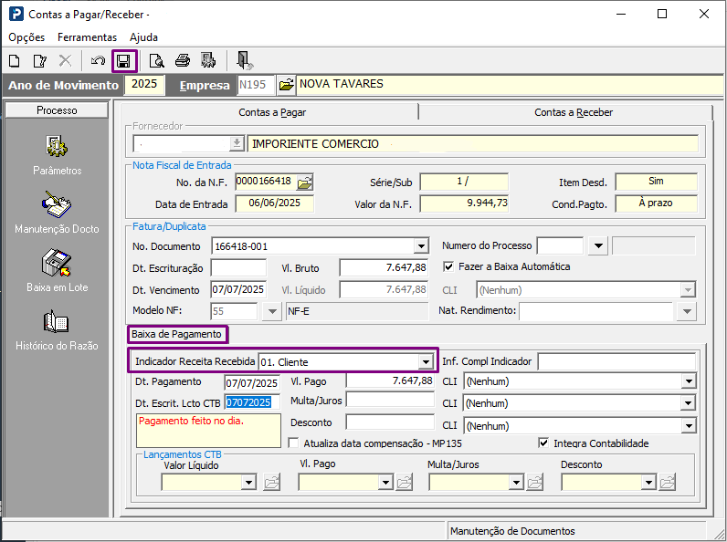 3- Para salvar a baixa da duplicata clique em Salvar, é obrigatório informar o campo Indicador de Receita Recebida