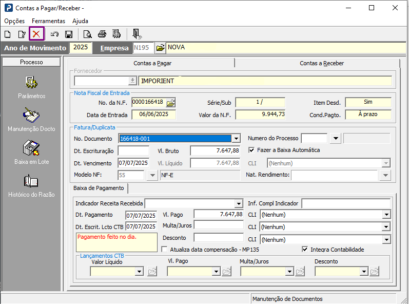 4- Para excluir a baixa de duplicatas, selecione a duplicata e clique no ícone Excluir.