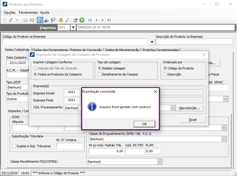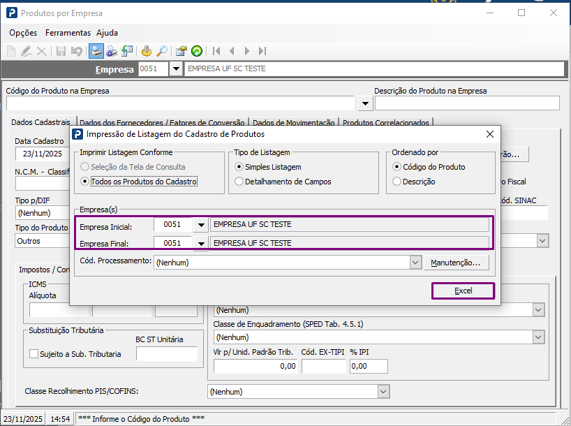 É possível gerar o Excel do cadastro de produtos para uma empresa ou um intervalo de empresas, utilizando o botão Excel:
