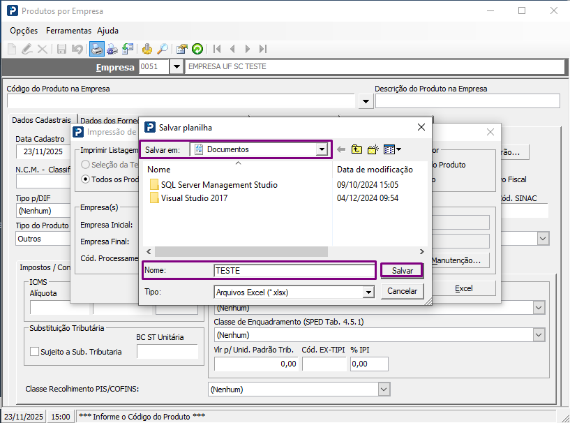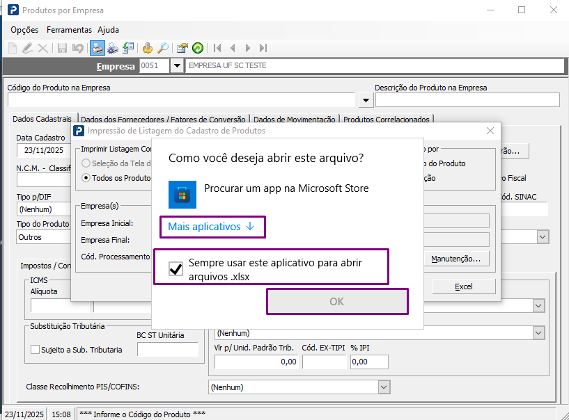 Obs.: Caso não possua o Office ou software similar instalado na máquina, o arquivo será gerado normalmente e somente sua abertura, necessitará de um software adequado, podendo este, ser transferido para outra máquina se necessário.