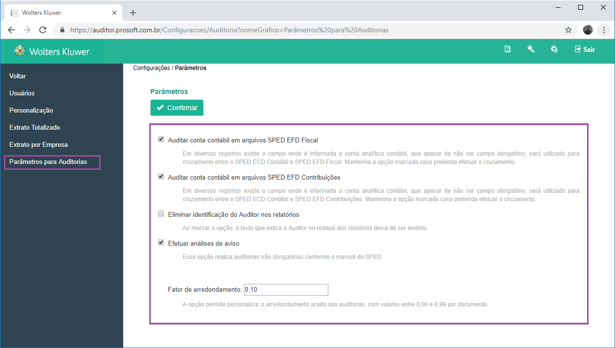 3- É possível realizar algumas configurações para realização das auditorias, referente a contas contábeis, arredondamentos e configuração de relatórios