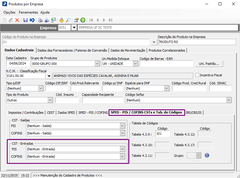 Após o procedimento, as CST PIS/COFINS Entradas foram alteradas para 50.