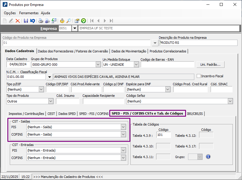 - Se informado o filtro CST - PIS ou CST - COFINS = (Nenhum - Saída), será apresentada a listagem de produtos que contenham na aba SPED - PIS/ COFINS CSTS e Tab. de Códigos, o CST - PIS e CST - COFINS Saídas preenchidos como (Nenhum - Saída).
