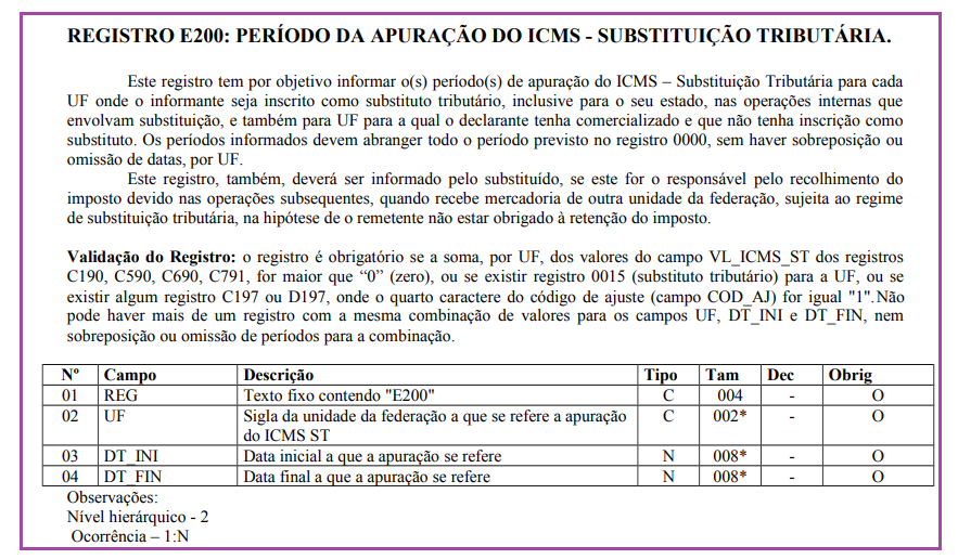 E o Registro E200 contém as informações de apuração de ICMS-ST