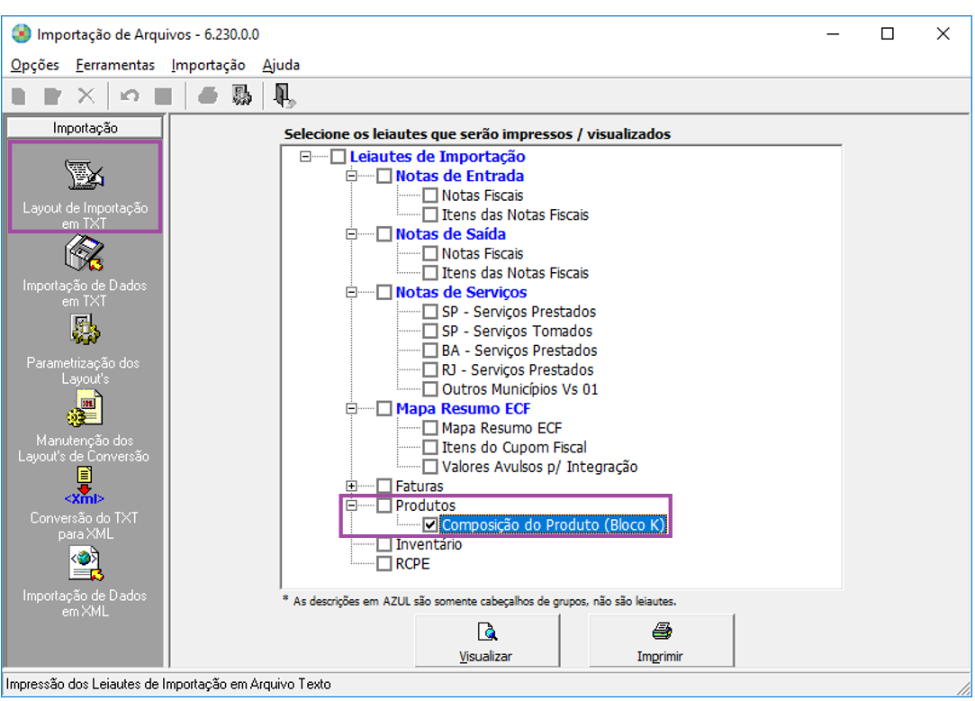 4- Clique na opção Produtos e depois no ícone + para expandir as opções e selecione Composição do Produto (Bloco K), em seguida clique no botão Visualizar