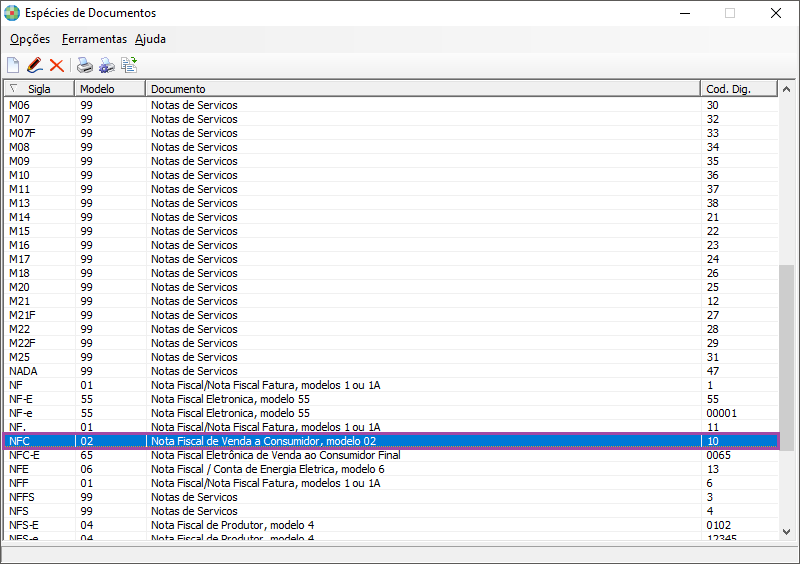 2- Localize a nota e informe na escrituração a espécie de documento modelo 02 cadastrada.