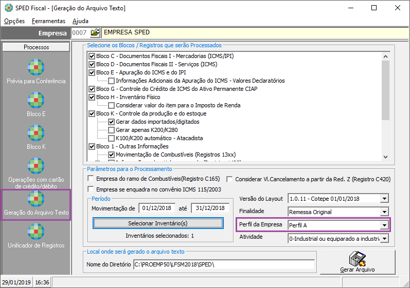 2- Na rotina de geração do arquivo texto marque o bloco C e selecione a opção do perfil A para a geração do arquivo texto, para empresas do perfil B o registro não é gerado.