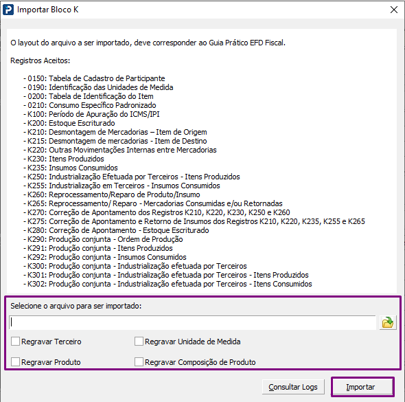 4- O sistema abre a tela de importação para o Bloco K, contendo os registros importados pela rotina, informe o diretório onde está salvo o arquivo a ser importado. Os campos Regravar Terceiro, Regravar Produto, Regravar Unidade de Medida e Regravar Composição de Produto, se selecionados são regravadas as informações já cadastradas no sistema, devendo ser selecionadas caso haja alteração no cadastro de algumas dessas informações.