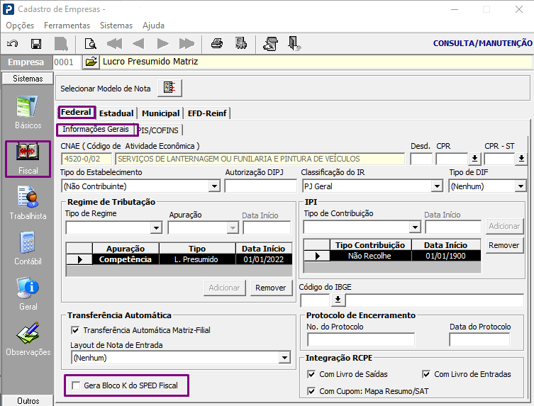 3- Marque a opção Gere Bloco K do SPED Fiscal e salve o cadastro